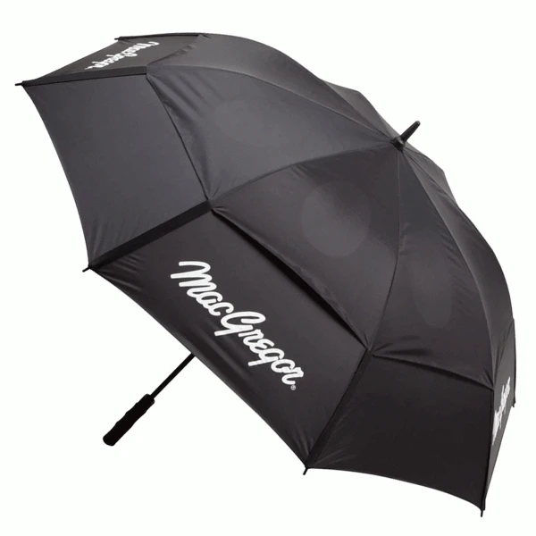 The MacGregor 62 Inch Dual Canopy Golf Umbrella offers exceptional coverage and technology to provide the ideal shelter from the rain and wind while out in bad weather conditions. A 62″ vented wind resistant dual canopy will provide enough coverage to keep you and your golf bag dry, a lightweight, reinforced fibreglass shaft adds strength to the umbrella. An ergonomic handle provides a comfortable carry and the size and shape of the handle will fit into the majority of umbrella holders.