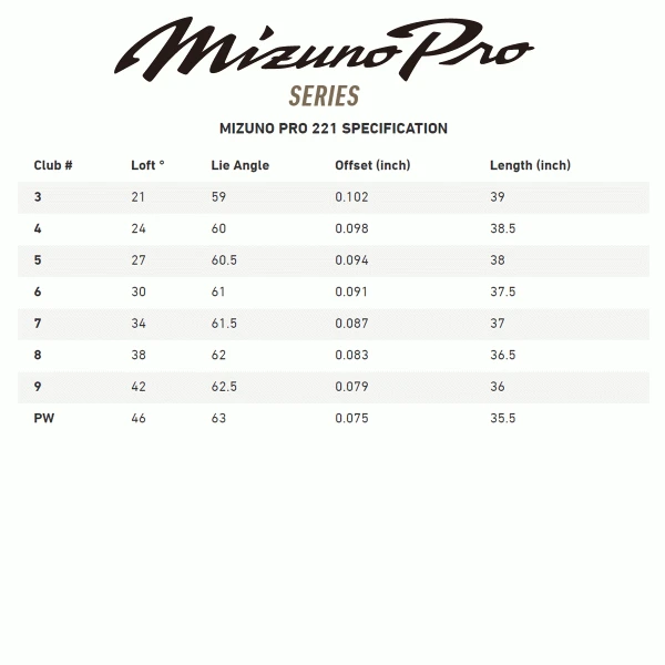 Introducing The Mizuno Pro 221 Irons when Mizuno sets out to update their legendary muscle-back irons, they make changes in small, incremental steps, in order to preserve the time-tested design. The new Pro 221 Iron, which replaces the outgoing MP-20, has evolved to be more playable through refinements in shape and weight placement. Mizuno bevelled the irons to deliver the appearance of a shorter face profile and narrower top-line, without eliminating the always-important upper blade mass.