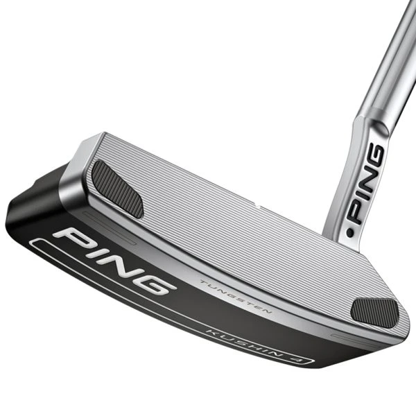 PING 2023 KUSHIN 4 PUTTER โ Tungsten toe and heel weights provide stability and forgiveness for improved accuracy, and the shallow milled face ensures a firmer feel and consistent ball speed with pleasing acoustics. A platinum topline contrasts against a black cavity to draw the focus forward, where a short alignment line and ball-width cavity floor frame the ball. Fits a strong-arc stroke type.