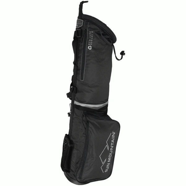The Sun Mountain 2023 Eco Lite Sunday Bag is constructed from Repreve® water-resistant fabric which is made from recycled plastic bottles. Extremely lightweight at just 2lbs the Eco Lite Sunday Bag features a 7 inch 2 way divider top which is capable of carrying a full set of golf clubs. The X-Strap® Dual Strap carry straps are made with thick, high-density foam that are contoured to be wider at the top of the shoulder for carry comfort. The Eco Lite Sunday Bag features 4 storage pockets including a velour-lined valuables pocket and multiple accessory pockets and comes complete with a matching rain hood.