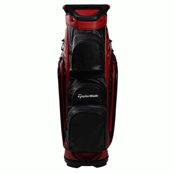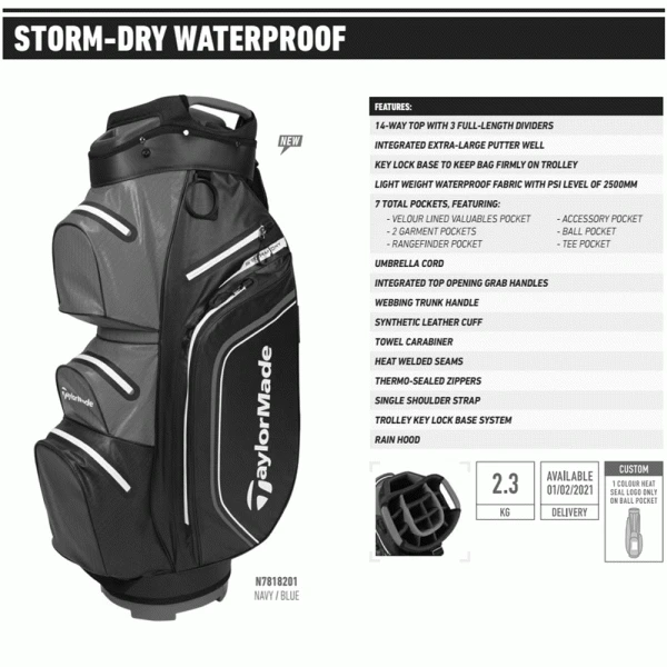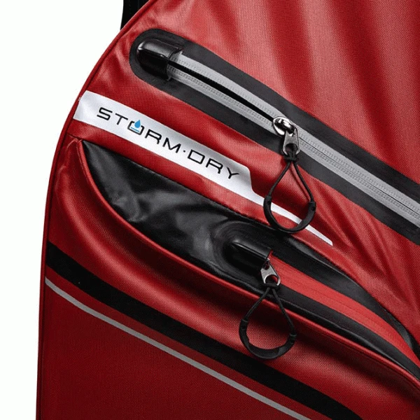 The TaylorMade Storm-Dry Waterproof Cart Bag is constructed from a light weight waterproof fabric with PSI level of 2500mm making it completely waterproof. The bag features a 14 way divider top with an integrated extra-large putter well. Other features include 7 storage pockets including a velour lined valuables pocket – 2 Garment pockets – Rangefinder pocket – Accessory pocket – Ball pocket & Tee pocket.