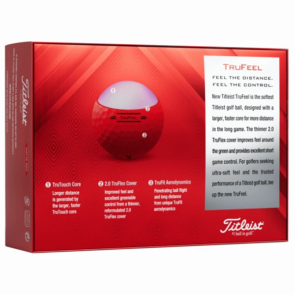 The Titleist TruFeel Golf Balls are the softest ball in the Titleist line and they just got a fresh redesign for even more distance and improved feel around the green. Titleist was able to generate more distance and a penetrating ball flight buy adding a larger, faster TruTouch core and pairing it with TruFit Aerodynamics. A thinner, reformulated 2.0 TruFlex cover allows for improved feel and excellent control around the green.
