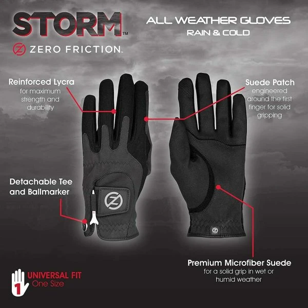 Count on Zero Friction Performance Golf to design Superior All Weather (Rain & Cold) Golf Gloves using Compression-Fit Technology. These gloves have all the great features of our original ZF Compression Fit technololgy golf glove with added warmth and durability for the colder months. They are knitted from a unique hollow core polyester yarn plus spandex that makes them warm, light weight, breathable and guaranteed to fit. The outer premium microfiber suede of the glove provides a non-slip grip for wet and humid conditions.